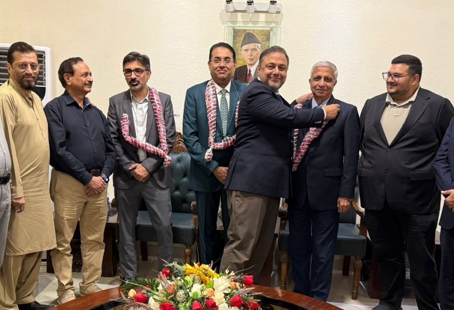 President of SITE Association of Industry, Mr. Ahmed Azeem Alvi, presents a bouquet to the newly elected office bearers of the Karachi Chamber of Commerce & Industry (KCCI): Mr. Muhammad Rehan Hanif (President), Mr. Muhammad Raza (Senior Vice President), and Mr. Arif Lakhani (Vice President), on the occasion of their assumption of charge.